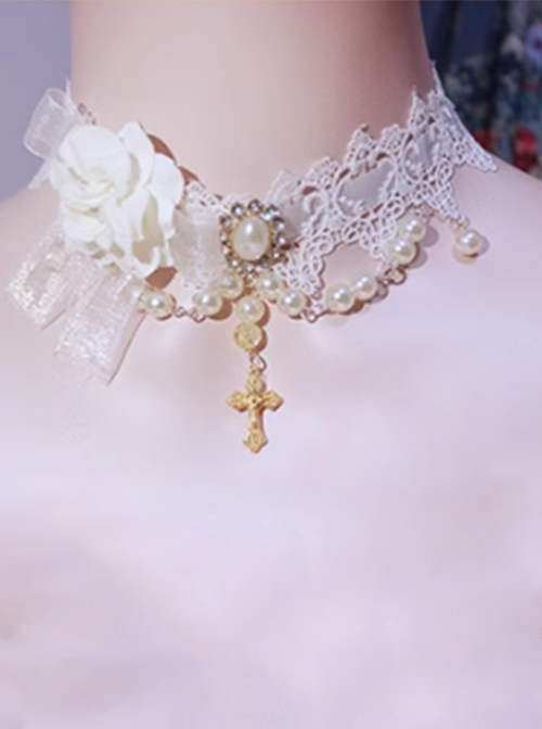White Golden Gorgeous Palace Style Pearl Chain Lace Flower Wedding Elegant Cross Pendant Classic Lolita Necklace