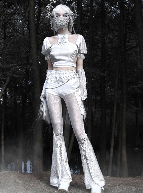 White Gothic Silver Dragon Series Embroidered Neckline Decoration Cutout Puff Sleeves Short Top