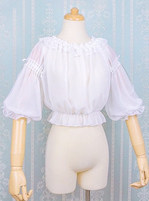 White Ruffled Lace Decoration Semi-Transparent Lantern Sleeve Fungus Edge Sweet Lolita Chiffon Half Sleeve Shirt