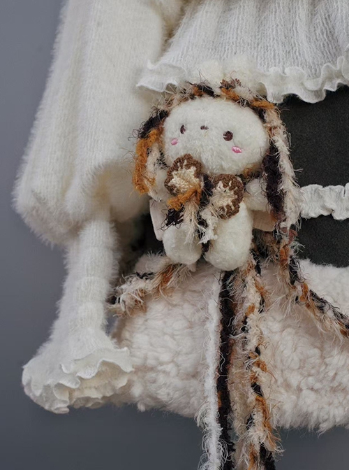 White knitted strapless sweater with loose lantern sleeves, showing shoulders. The short skirt is made of lambskin with ruffles and decorated with wool bunny dolls.