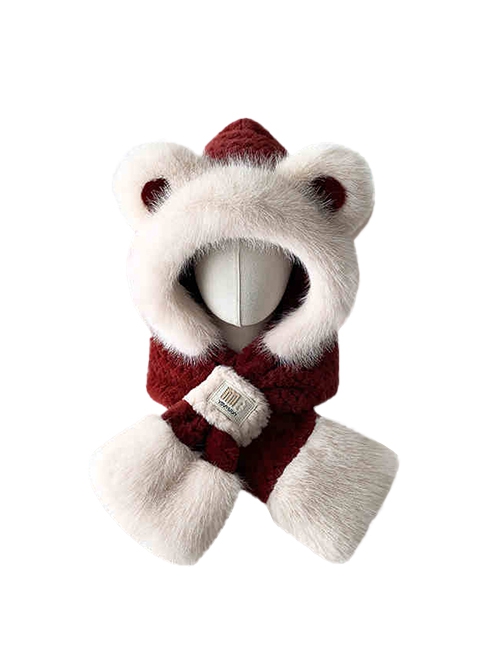 Winter Warm Cute Bear Kawaii Fashion Thickened Windproof Tab Plush Hat Splicing Short Scarf