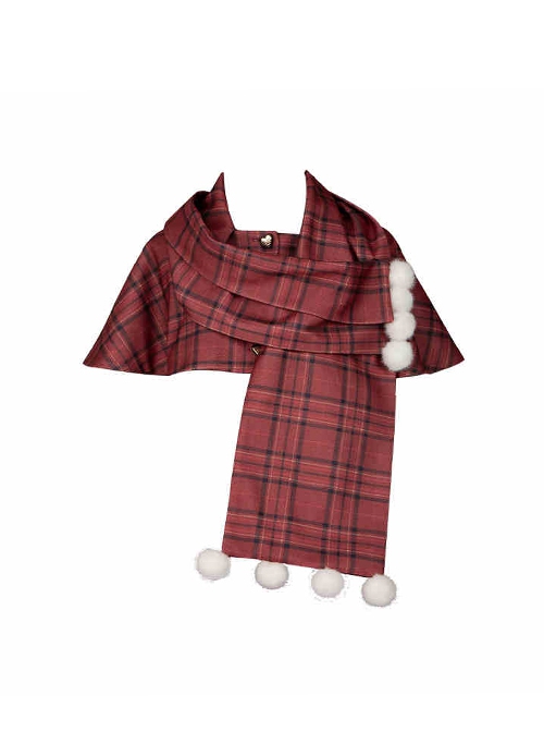 The short red plaid cape combines the shape of a scarf with a white pompom at the end, making it cute and sweet.