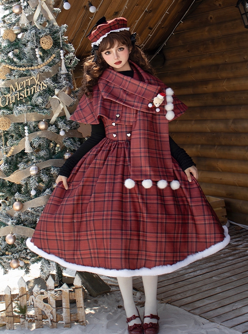 Wish Appointment Series Christmas Cute Sweet Lolita Red Plaid Hairball Short Woolen Scarf Cape