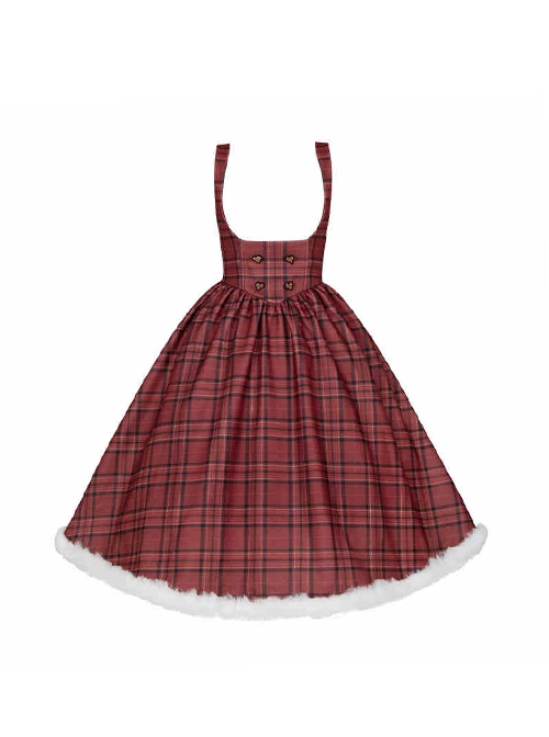 Wish Appointment Series Christmas New Year Elegant Sweet Lolita Red Plaid Plush Edge Suspender Long Dress