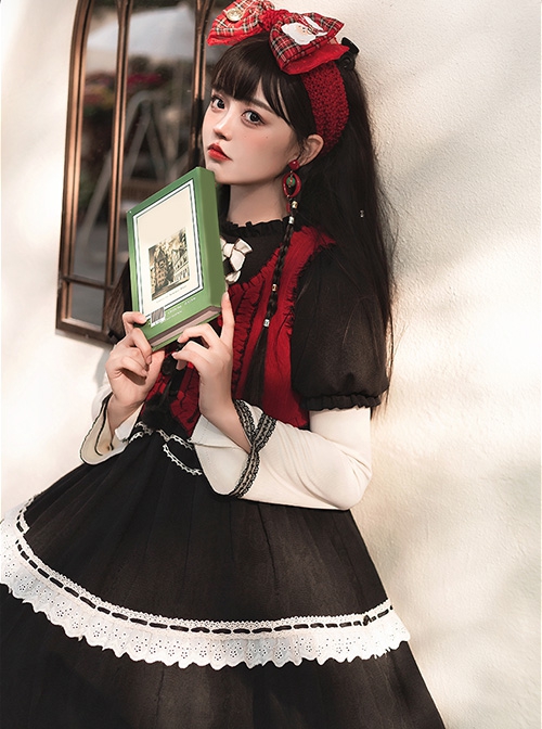 Wish Gift Box Series Cute Red Corduroy Vest Irregular Cuffs Lace Fake Three Pieces Classic Lolita Long Sleeve Dress Set