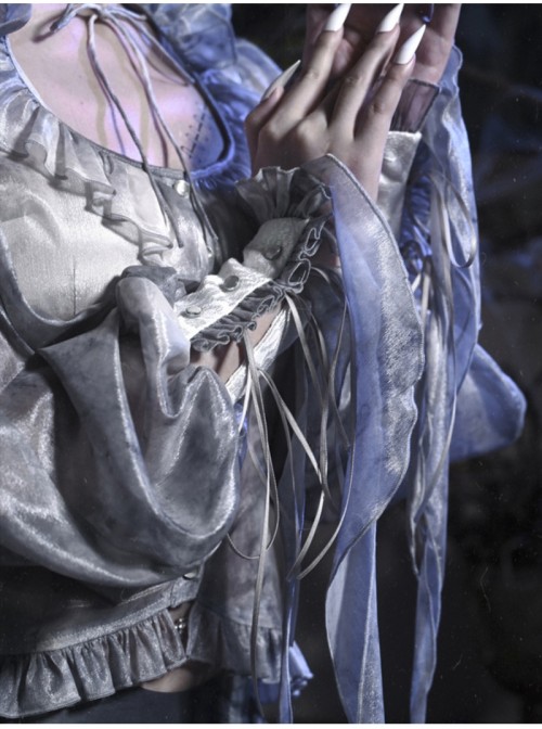 This zombie bride themed shirt is very suitable for Halloween. It refers to the dressing style of the Victorian era. It uses tie-dyed old gray-blue chiffon fabric, has a side waist, and a lace pleated design with a court feel.